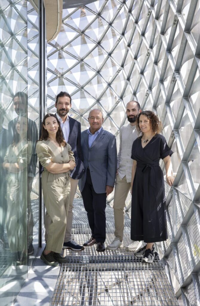 El lugar en cuestión es la sede de la empresa Vrio, que despliega todo su esplendor en medio de un polígono industrial al uso. Hileras de naves industriales se suceden. No hay nada ligeramente parecido a su alrededor. Una de sus salas es hoy el escenario de la entrevista para este reportaje. Participan los cinco integrantes del estudio que han hecho posible esta virguería arquitectónica: Juan Antonio Santa-Cruz Alemán, el fundador; sus hijos Toño y Carmen; y sus parejas, Beatriz Lorente y Javier Escriva, todos arquitectos, todos parte de la misma familia. “Nos entendemos muy bien, tenemos claro qué es lo importante. Somos familia y nos dejamos la piel por este proyecto”, coinciden varias veces durante la conversación.