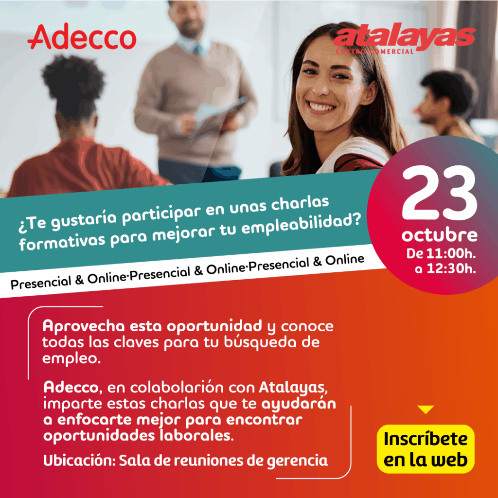 En concreto, todas las personas interesadas en asistir y conocer de primera mano las claves para mejorar su entrada o desarrollo en el mundo laboral deberán rellenar el formulario de inscripción a través de la página web de Adecco, que también se encuentra disponible en la web de Atalayas (www.centrocomercialatalayas.com).