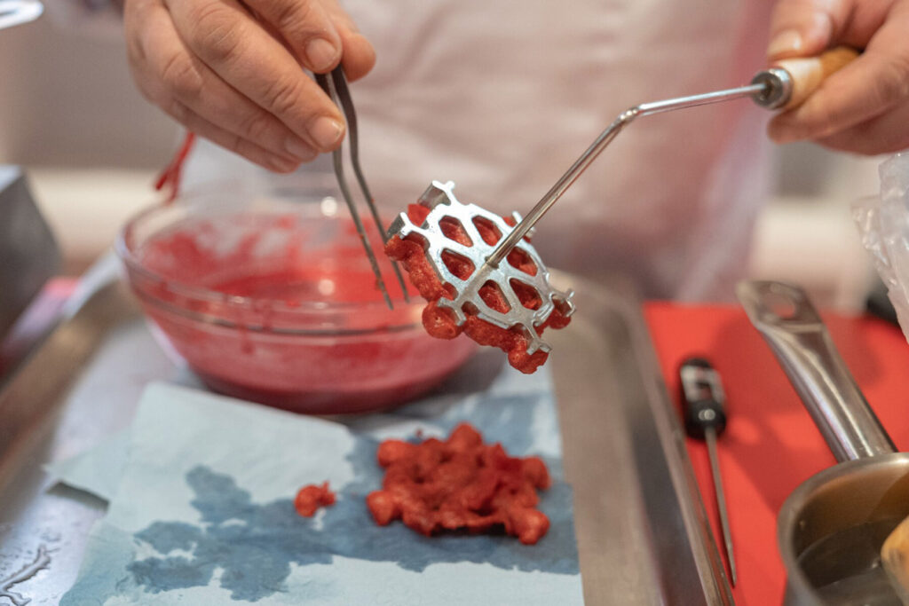La receta combina ingredientes profundamente ligados a la identidad gastronómica regional, como la gamba roja de Águilas, el limón murciano y la remolacha, logrando un bocado sorprendente tanto en sabor como en presentación.